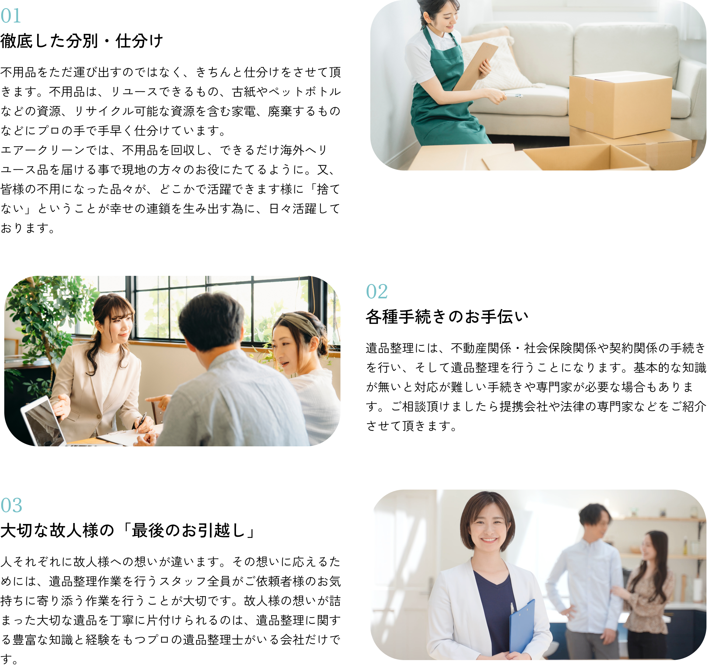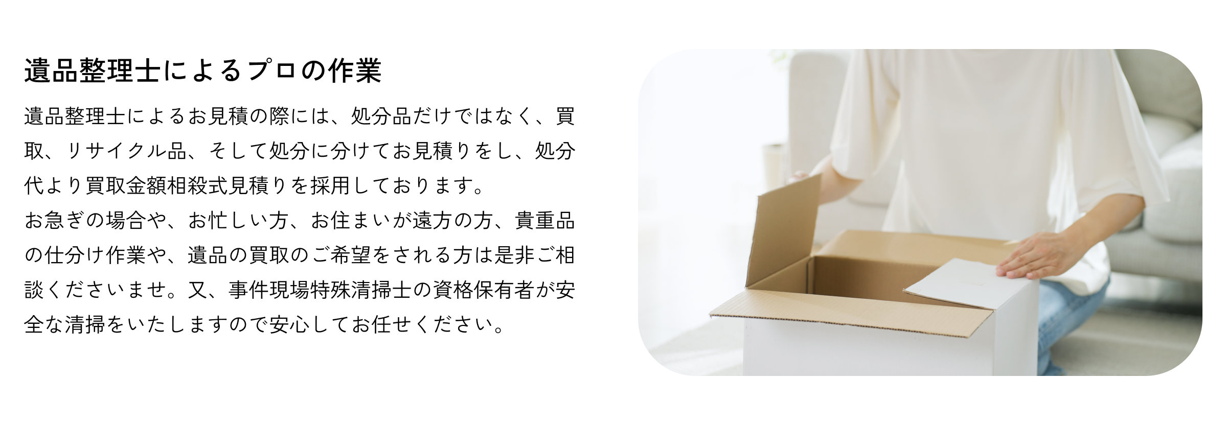 供養の心をもち、ご遺族の方々が遺品の整理と共に思い出を整理し、前を向いて進んでいけるように私たちが親身になってサポートさせていただきます。