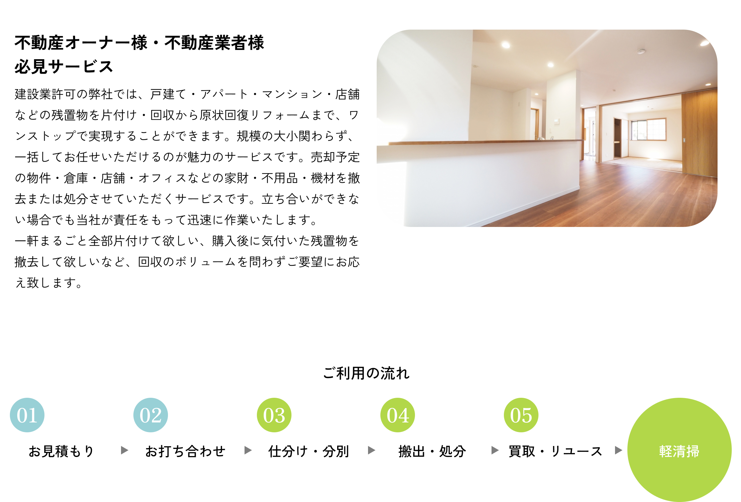 リサイクルやリユースで廃棄の量を減らし、環境にやさしい取り組みを精力的に行っております。建設業の許可がある弊社では、清掃後の住宅リフォームも施工できるので、ご負担のかからない価格と工数で原状回復・リフォームを実現可能です。