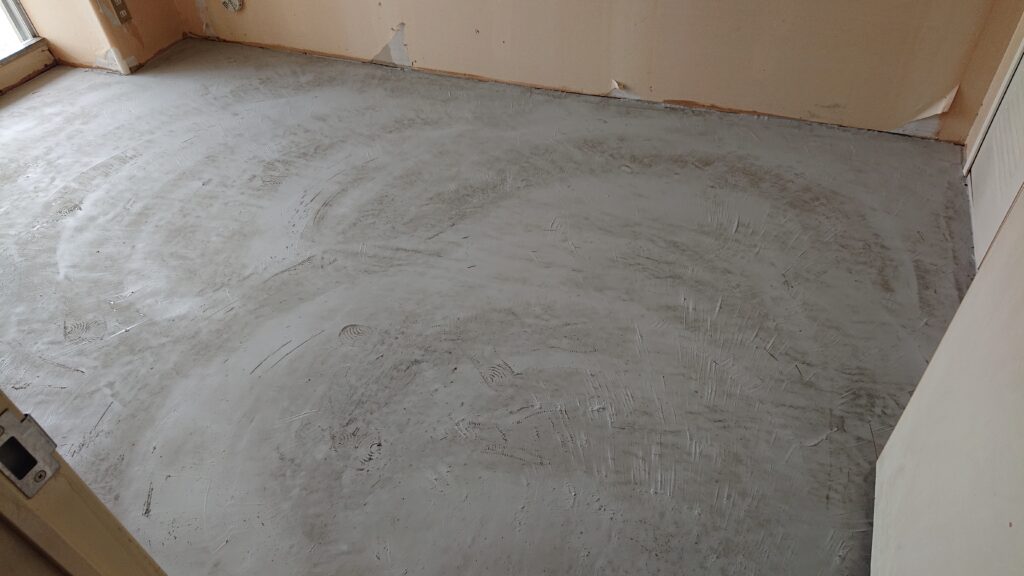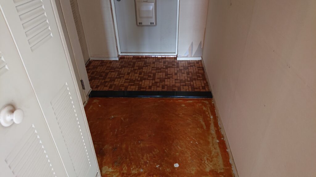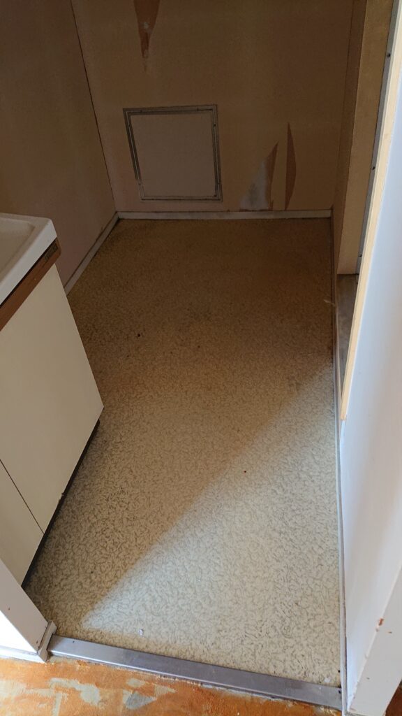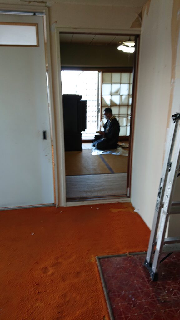 家財が全て無くなりましたら、壁紙にまで臭いが付いておりますので全室の壁紙を剥がします。汚染物箇所の絨毯も剥がし下はコンクリートでした。ボンドで貼り付けていたのでボンドも研磨して取り除きます。その後洗い作業。あまり水を使うと水漏れの原因になりますので、洗剤と水拭きを何度も致します。その後特殊塗料を塗り臭いは消えます。